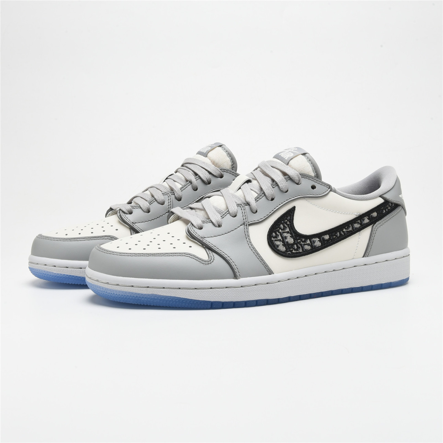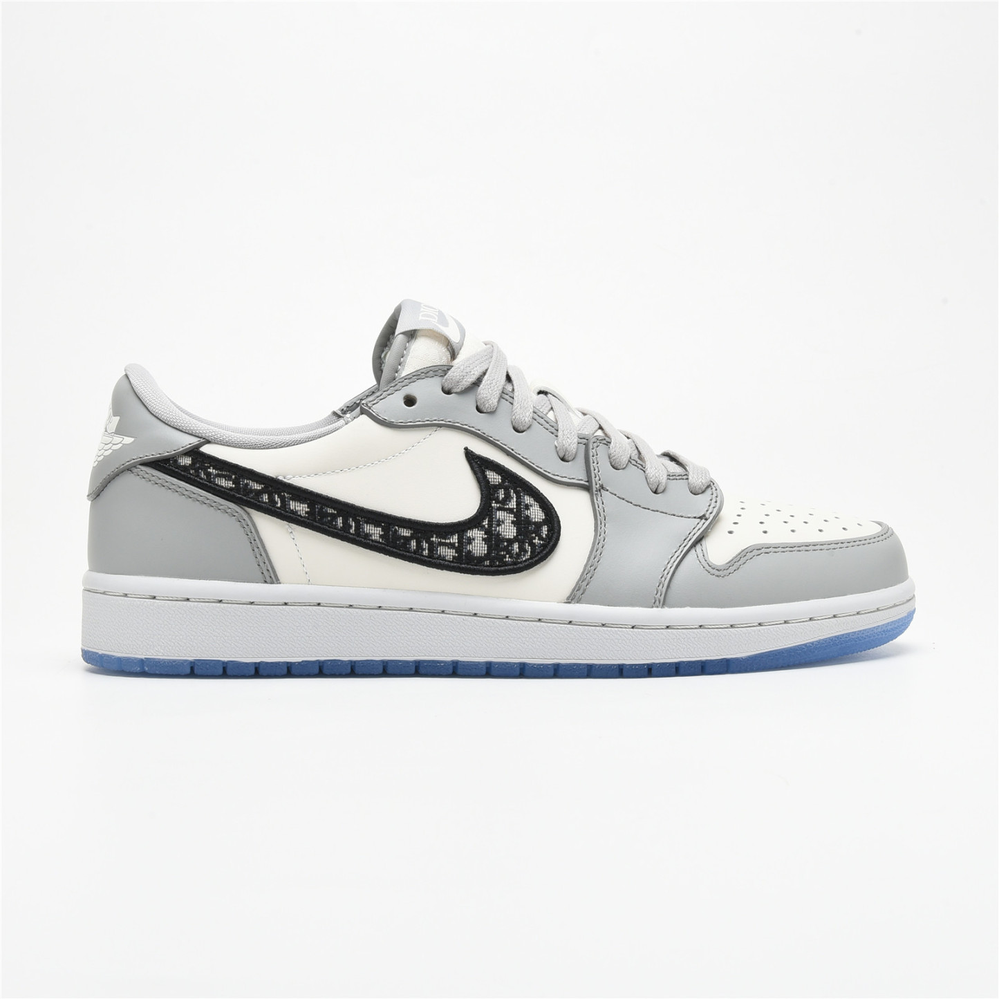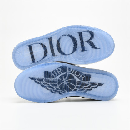 This Jordan 1 Retro High is composed of a white and grey leather upper with traditional Dior monogram print Swoosh. These shoes are made in Italy with premium materials. Co-branded icy translucent soles, Dior branded tongue and Wings logo, and a silver "Air Dior" hang tag completes the design.