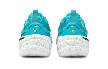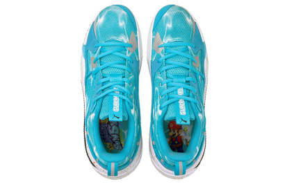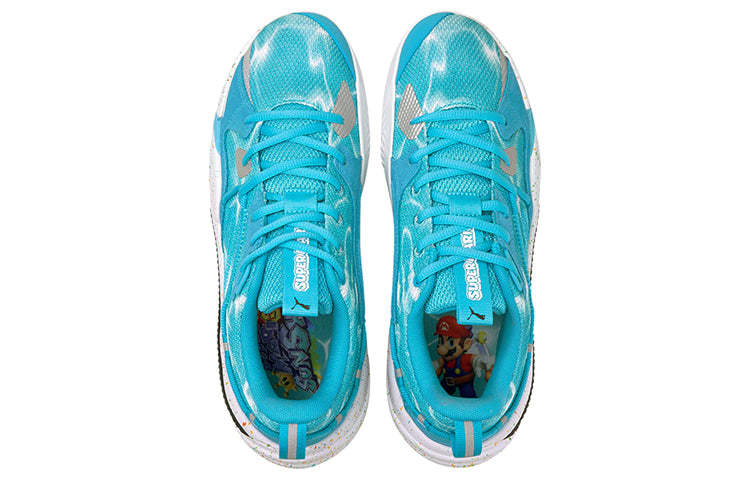 The Nintendo x J.Cole x PUttgMA RS-Dreamer 'Super Mario Sunshine' is a commemorative hoops shoe celebrating the 35th anniversary of the Super Mario franchise. The tropical setting of Isle Delfino inspires its vibrant colorway, featuring a watery blue textile upper with Shine Sprites adorning the heel tabs. Multicolor speckled detailing cover the ProFoam midsole, equipped with RS-Foam in the heel for superior impact protection. J. Cole's signature makes this an instant classic for any fan of the game or hip hop.