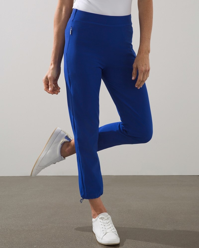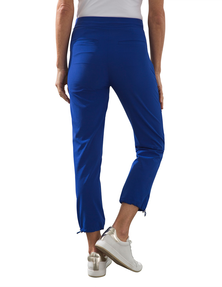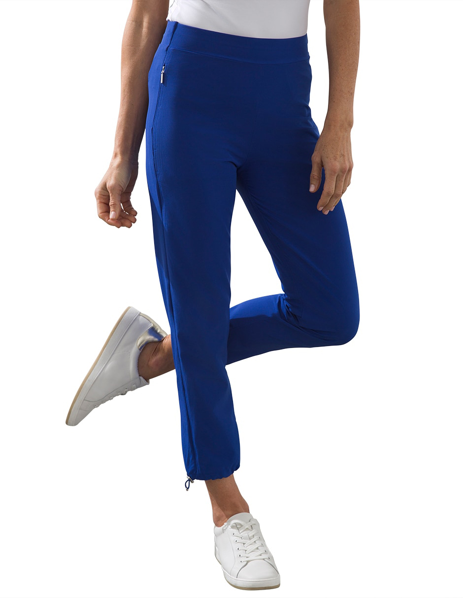 - The Fit: Classic fit; invisible side zipper pockets, back slit pockets, pull-on, clean waistband, adjustable bungee at ankle; 24" inseam.